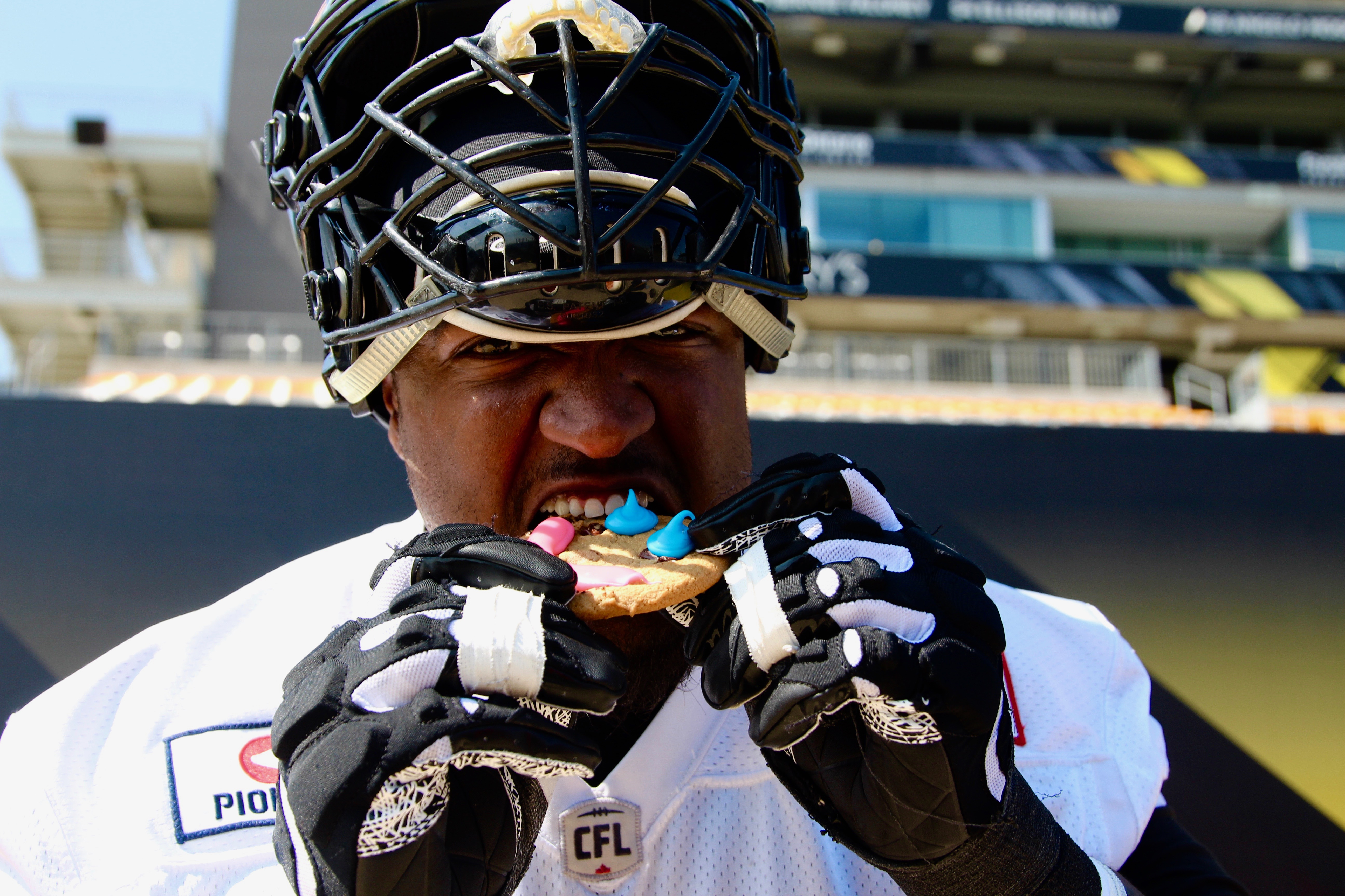 Hamilton Tiger-Cats pose with Tim Hortons Smile Cookies, purchases made that day support local charities